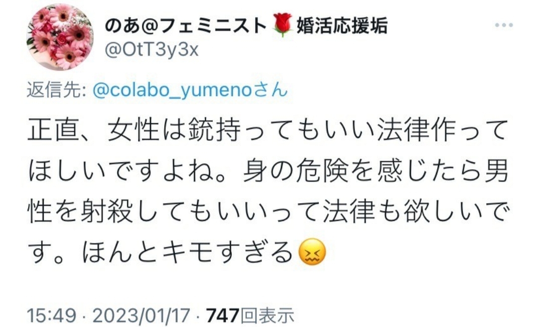 銃所持する時点で男より強者になってんのにメンタルだけ弱者のまま暴力を自由に行使しようとするな