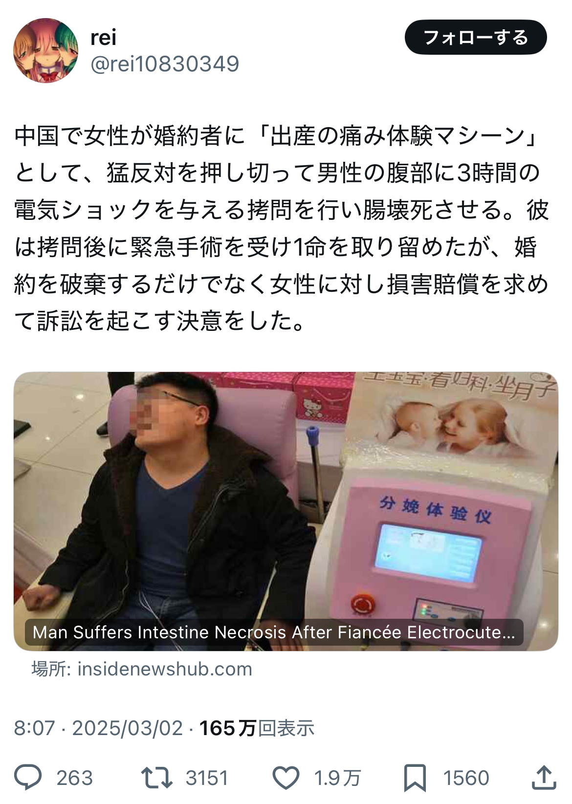 最高レベルの痛みを3時間も体験させられた男性は意識を失い、小腸が壊死した。